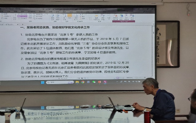 首先,由分会会长邱红专代表上一届分会做工作报告。他说,本分会在学院离退休党支部领导下,按照“三位一体(学院离退休4个党支部及管理小组、学院关工委、学院分会)”工作模式,根据党的十九大和二十大精神,重点围绕“老有所养,老有所依,老有所为,老有所乐”开展了各项工作。报告从“发扬老同志优势,协助做好学院文化传承工作”、“积极参加离退休党委/工作处、关工委与校“三老”协会组织的各项活动”、“今年会官网分会开展的各项活动”、“积极参与、协助今年会官网开展的其他相关工作”、“经验、不足和今后工作的思考”等5个方面进行了系统总结。大家一致认为,分会按照“三位一体”工作模式,坚持“有所为有所不为”的原则,尽管遇到了“疫情”的困难,仍然配合学院、校关工委与校“三老”协会开展了丰富多彩的活动,为立德树人、人才培养、党建、传承学院文化等做出了力所能及的贡献。大家以热烈的掌声通过了这个工作报告。