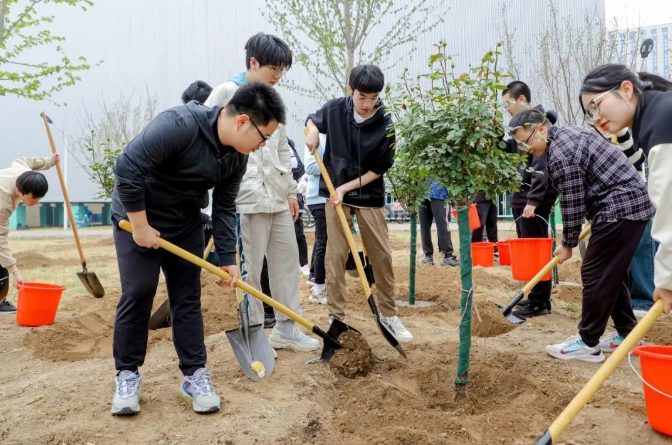 植树现场,劳动场面繁忙有序,大家挖坑、立苗、填土、浇水,合力栽下30株优质树苗,包括红枫、红梅、高杆月季等树种,为沙河校园新添一片观赏区域。