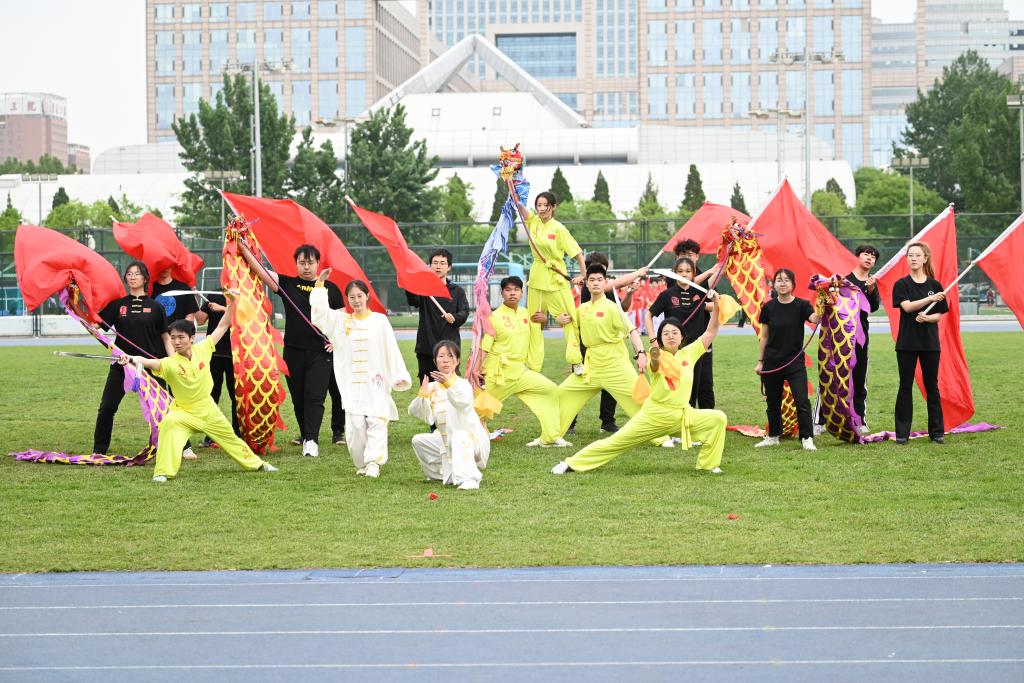 暖场环节,北航篮球、跆拳道、轮滑、武术等多个社团现场展示校园文化建设成果,充分展示了青年学子积极昂扬的精神风貌。北航武术队带来表演《少年侠气》,将太极、长拳、刀剑、旗阵和彩带龙等元素有机融合,传递中华武术精髓,发扬体育精神;行进管乐团激情演奏《我的祖国》,乐声嘹亮,步伐铿锵。